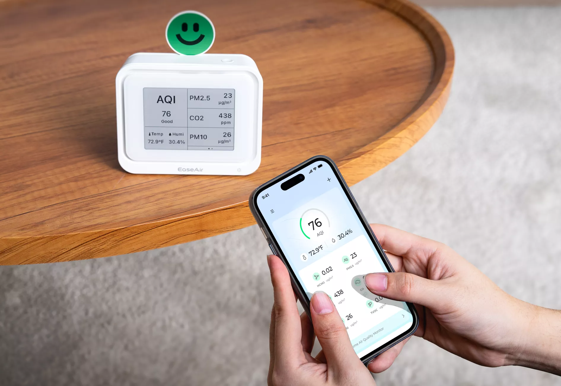 E-ink display powers a month-long battery life for extended air monitoring.